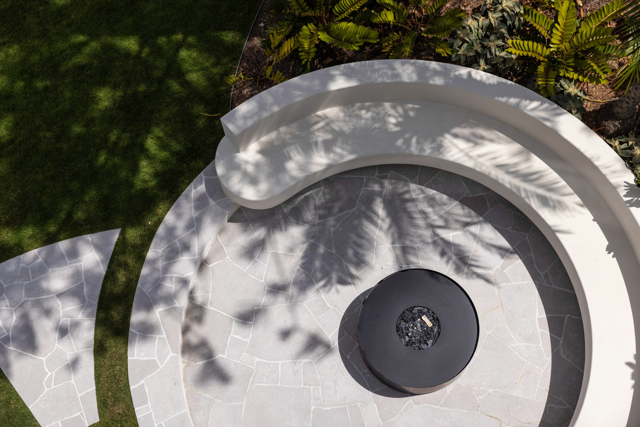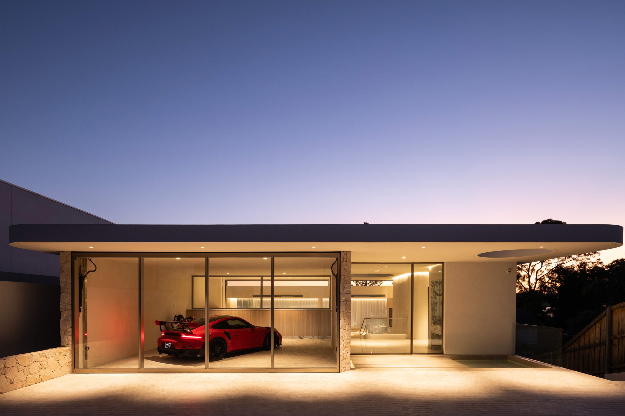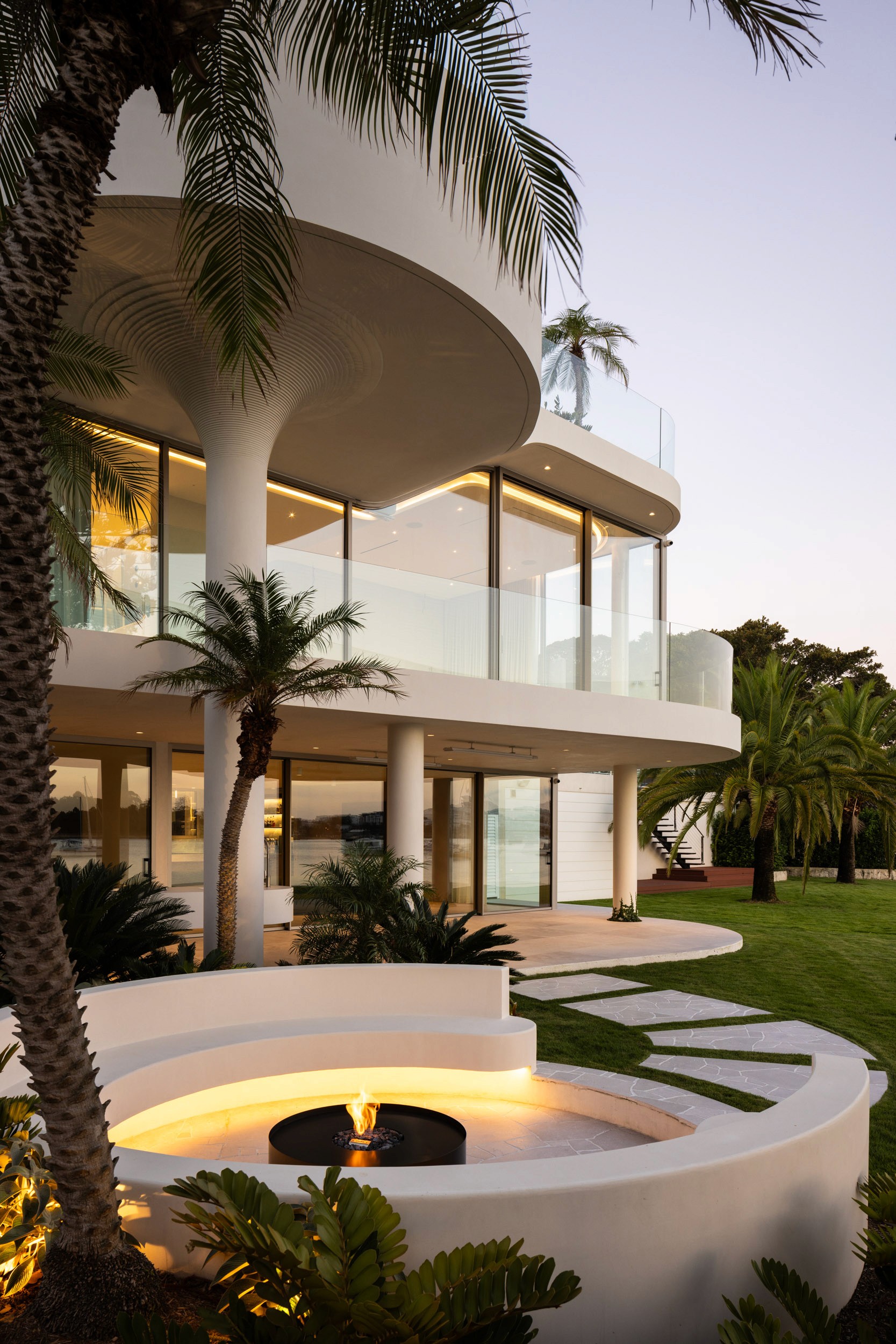 Soft, integrated lighting accentuates the building’s elegant geometry at dusk, while palms and manicured gardens enhance its refined, resort-like atmosphere. A sunken circular firepit anchors the outdoor space, creating an intimate retreat that seamlessly connects the architecture to its tranquil waterfront setting.